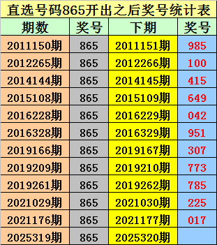 排列三直选865出现之后下期奖号分别为:985-100-415-649-042-951-307-773-785-225-017。