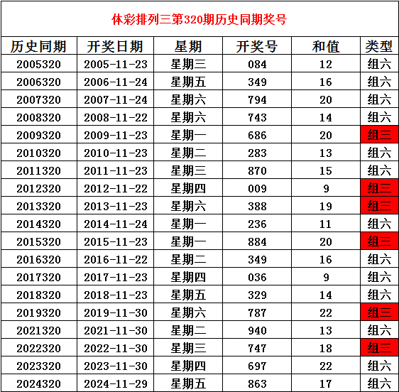 2025年11月30日排列三第320期开奖,历史同期分别开出奖号: