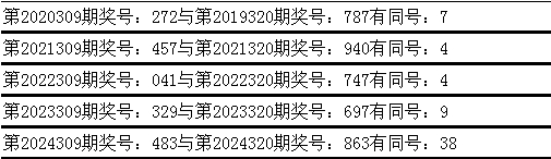 与前期历史同期奖号对比分析,在最近五年开奖中,第309期同期奖号与第320期同期奖号都出现了相同号码: